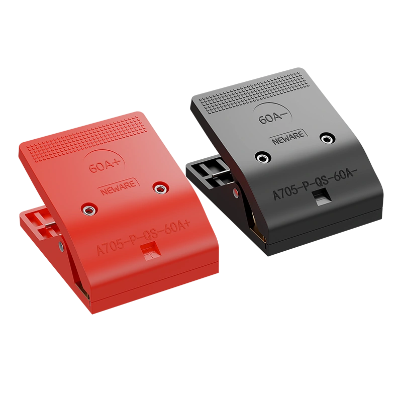 Resistant to high temperatures, low internal resistance ensures efficient current transmission, strong clamping securely fixes the battery, and can be used with a guide rail to fix the battery rack. Combined with the A705-P-QS-60A- negative clamp, it is used for testing 30A to 60A pouch batteries, including charging and discharging, capacitance voltage, and formation and capacity grading.